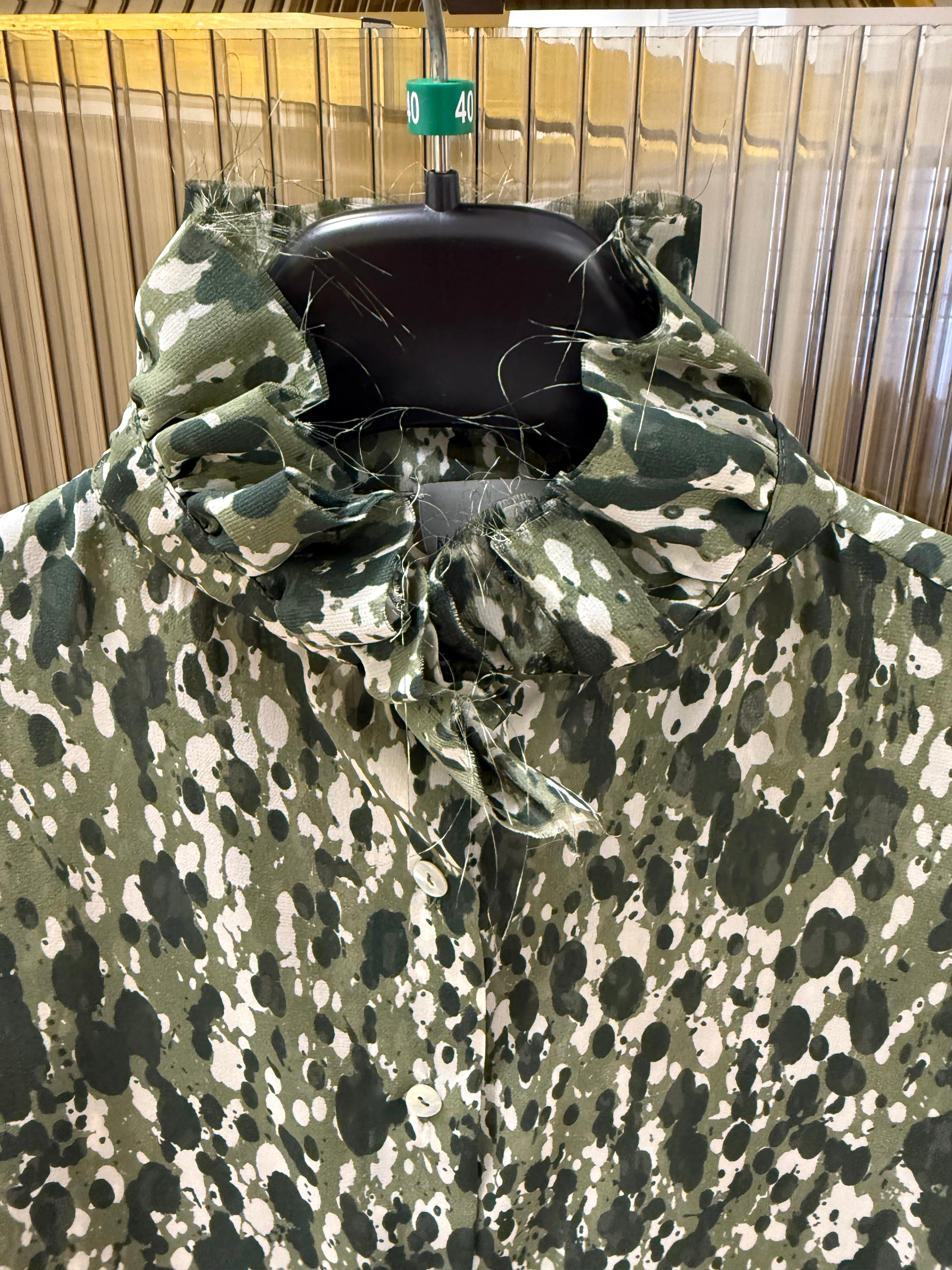Un capo che unisce leggerezza e carattere. Realizzata in seta impalpabile, presenta cuciture lasciate a vivo che ne esaltano il carattere autentico e contemporaneo. Il collo a pieghe e i polsi plissettati richiamano la delicatezza del costume Pierrot, reinterpretato in chiave sartoriale e moderna.