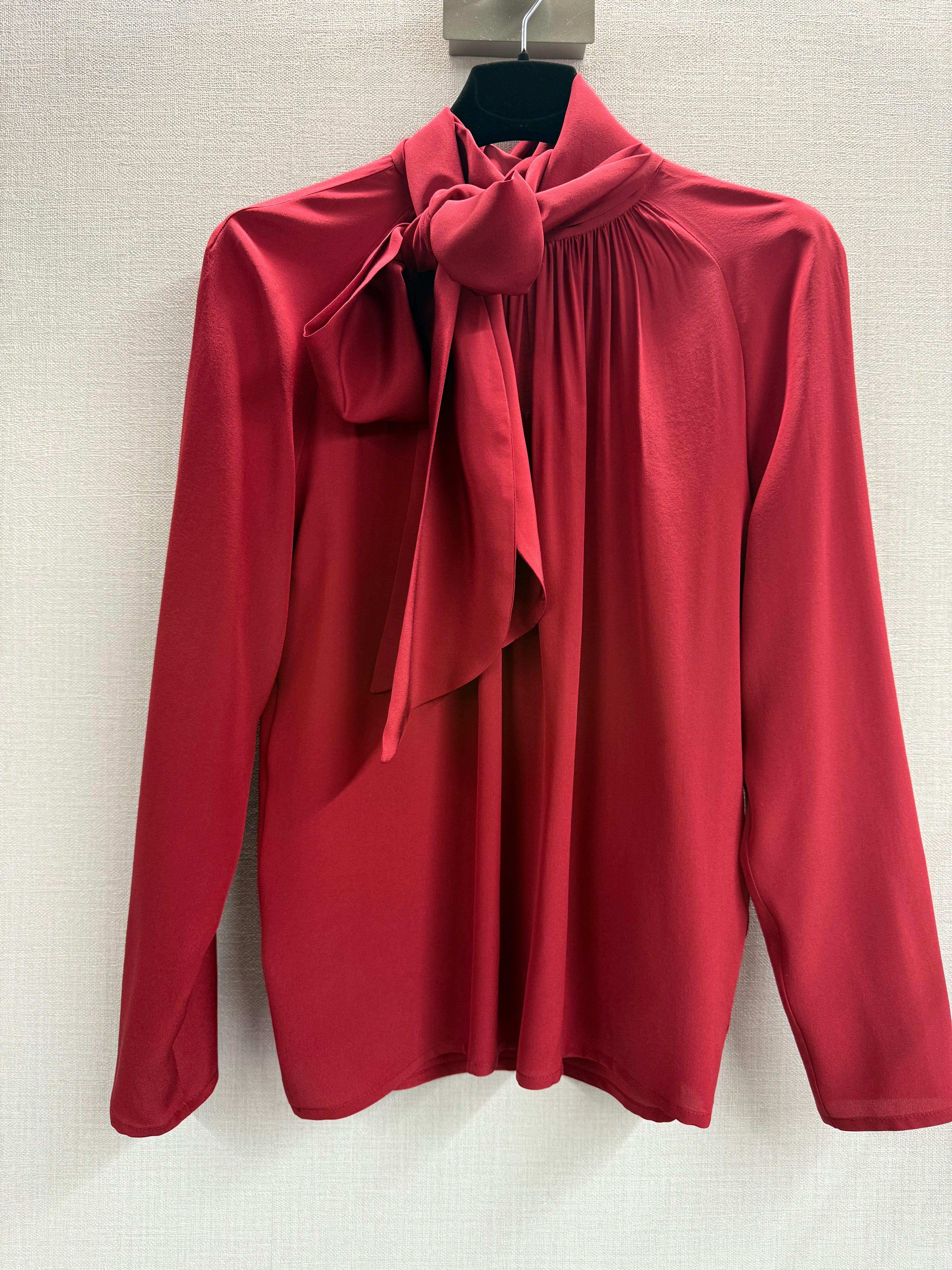 La blusa in pura seta che non ti stanca mai, il collo alto che slancia la silhouette e la lavallière da annodare al collo in mille modi, la rendono la blusa ideale per completare ogni outfit.