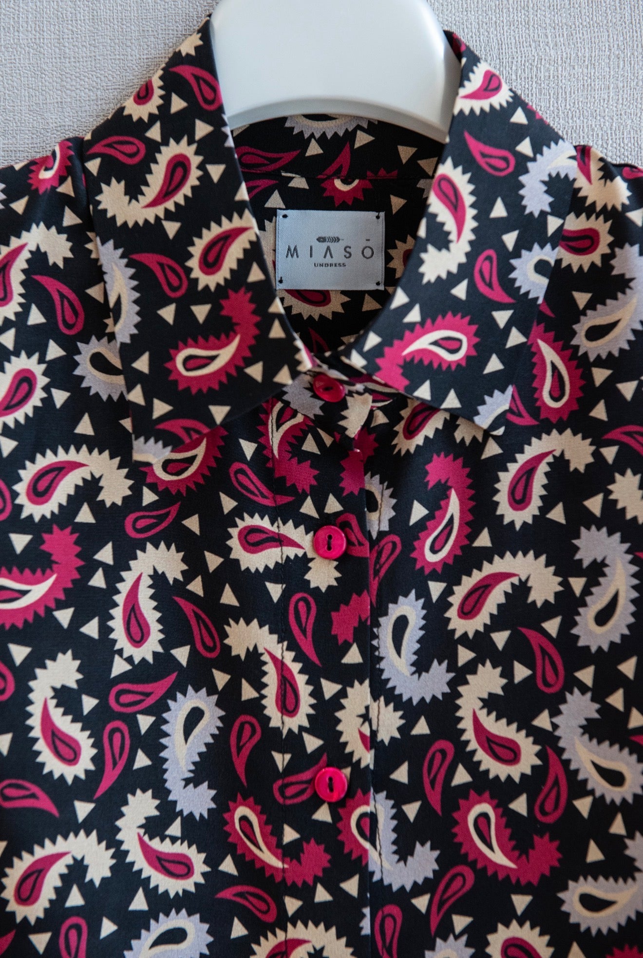 Questa fantasia essendo colorata ben si abbina a molteplici combinazioni da un semplice pantalone nero a un più azzardato accostamento con il ciclamino o rosa. Sicuramente è una fantasia  che da personalità ad un outfit essenziale.