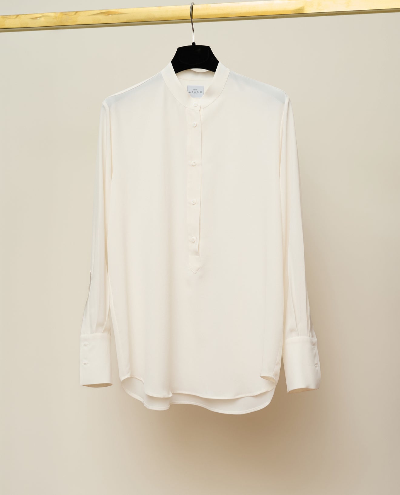 Realizzata in double crêpe de chine di seta, si distingue per la sua mano fluida e corposa, che regala caduta perfetta e comfort sulla pelle.