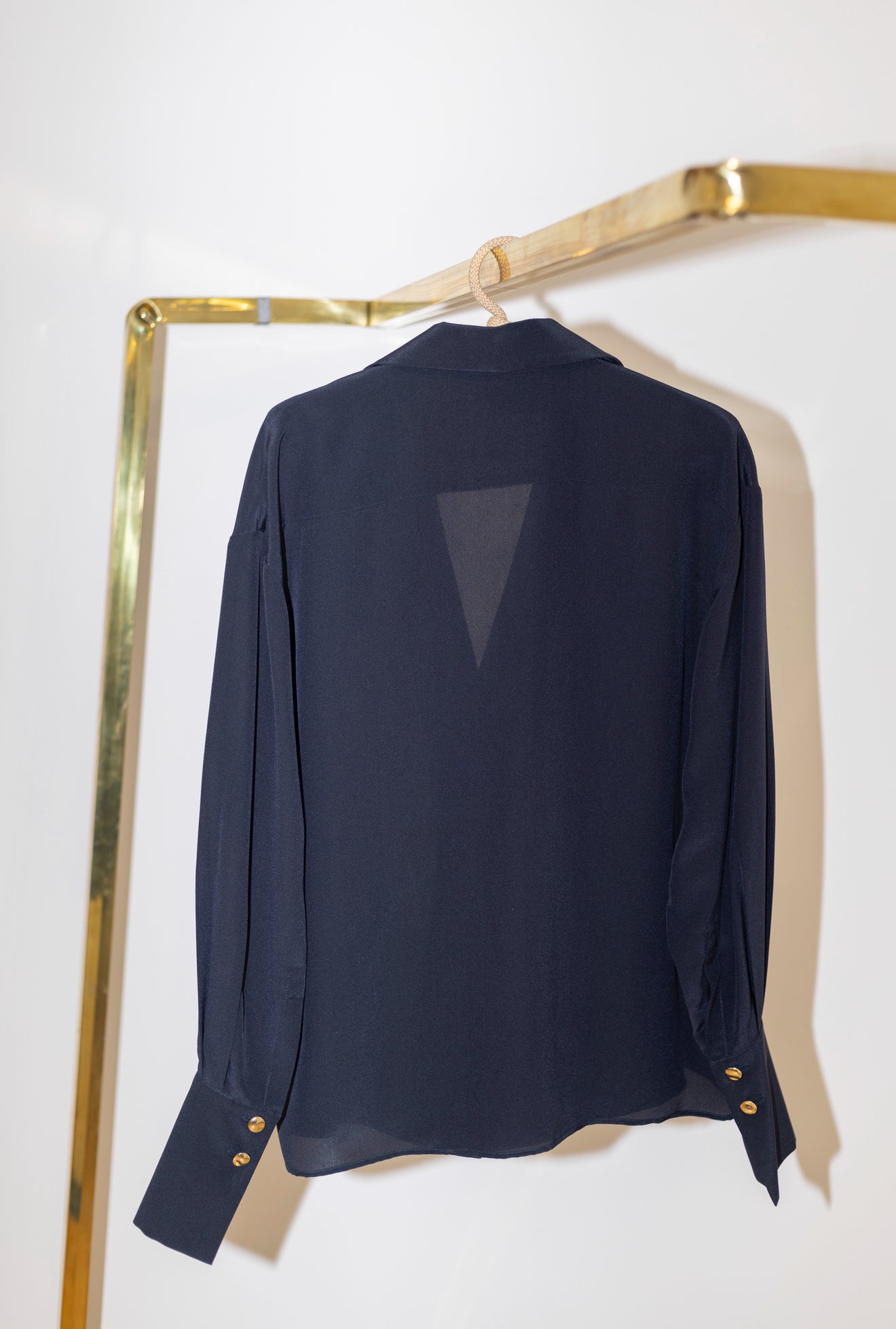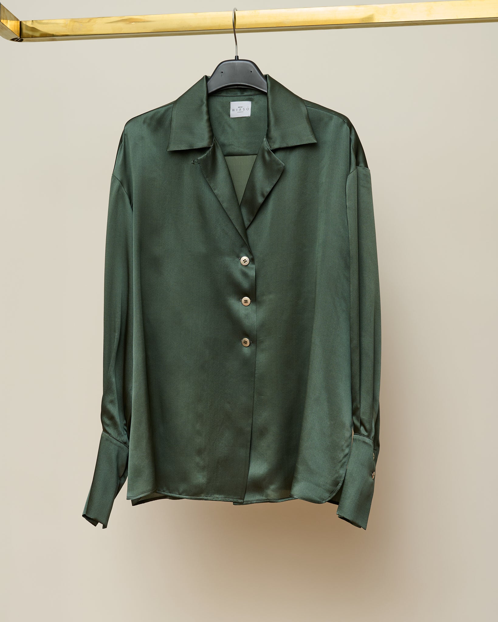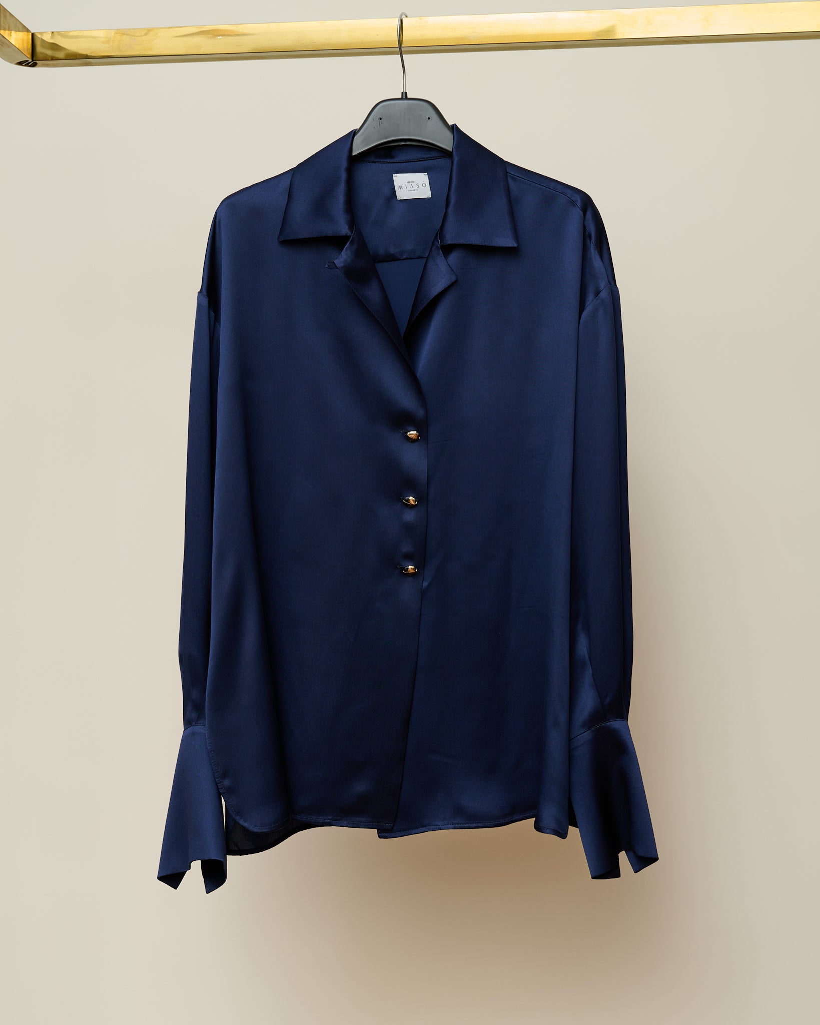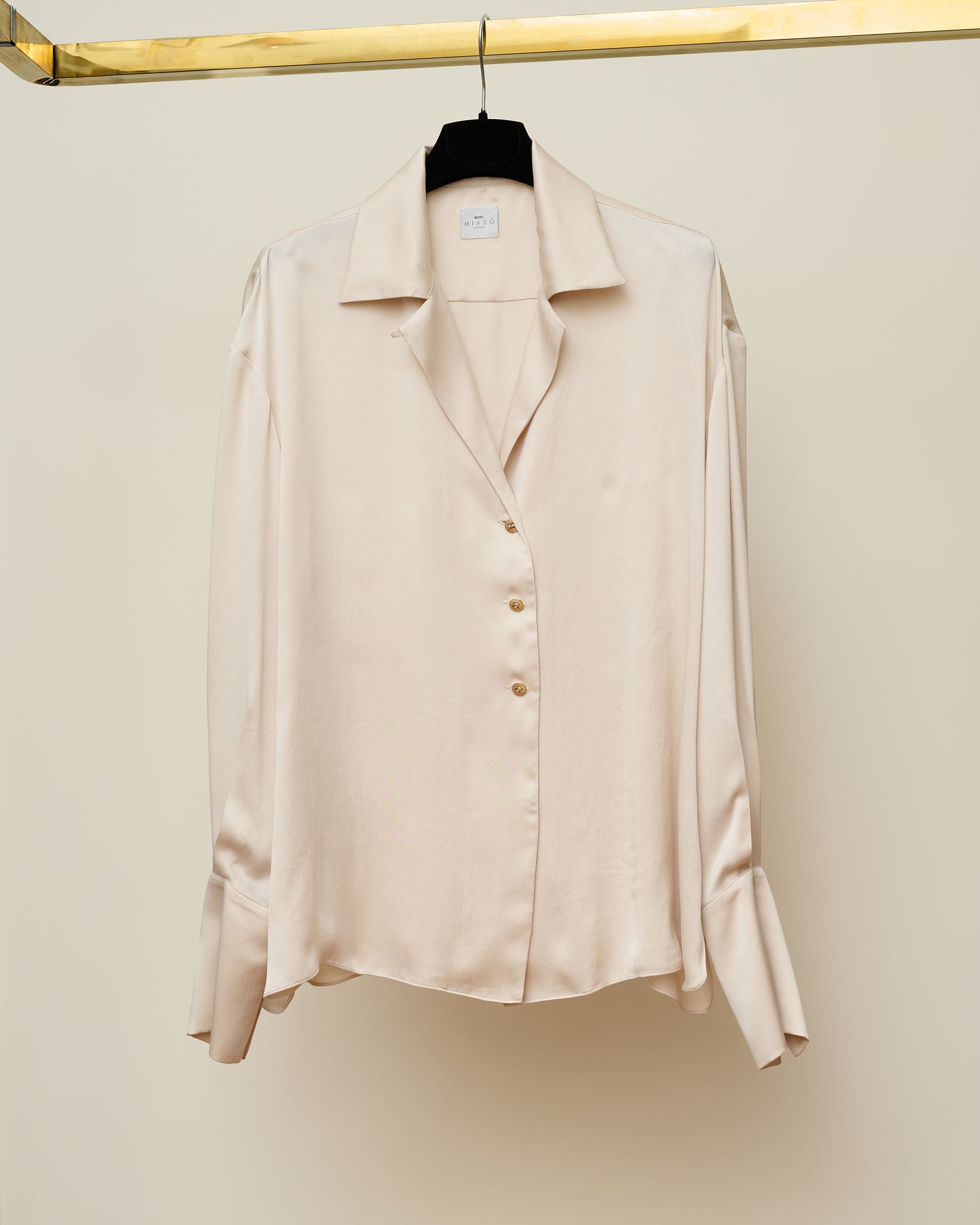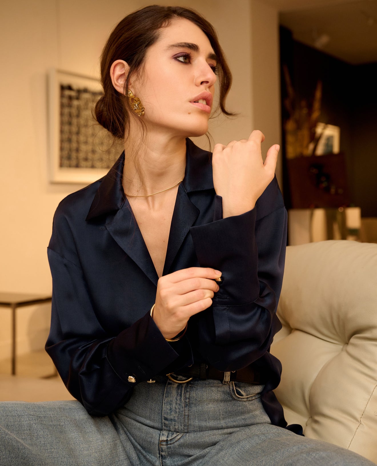 Camicia in pura seta, dal fit over ma avvolgente. Il design riprende la linea della camicia da pigiama, rivisitata in chiave sartoriale e contemporanea, con revers che si possono portare aperti o abbottonato dando vita praticamente ad un’altra blusa!