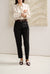 Modello a vita media, chiusura frontale nascosta, tasche a soffietto ai lati, due tasche posteriori nascoste, pence con piega stirata, gamba affusolata, passanti in vita.