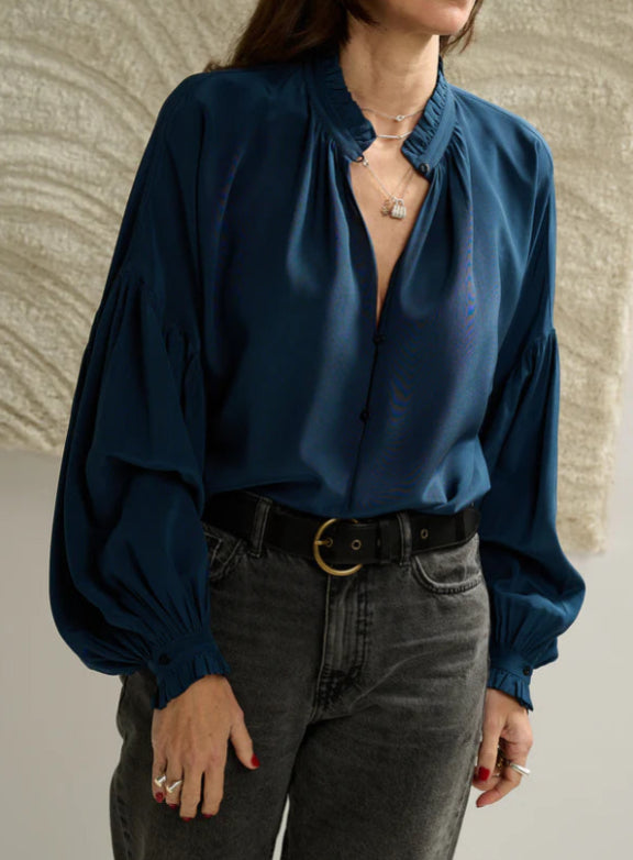 Presentiamo con orgoglio la nostra esclusiva blusa in crêpe de chine, un autentico capolavoro dell'artigianato sartoriale. Il piccolo collo plissettato conferisce un tocco di eleganza senza tempo, mentre la spalla scesa e la manica con piccolo polso plissettato aggiungono un tocco di modernità alla tradizione. Ogni dettaglio, incluso il Plissé fatto a mano dalle nostre esperte sarte, riflette la cura e l'attenzione dedicata a ogni fase della produzione. Questa blusa incarna il lusso discreto e raffinato, perfetta per chi ricerca un capo esclusivo che esprima personalità e stile unico.